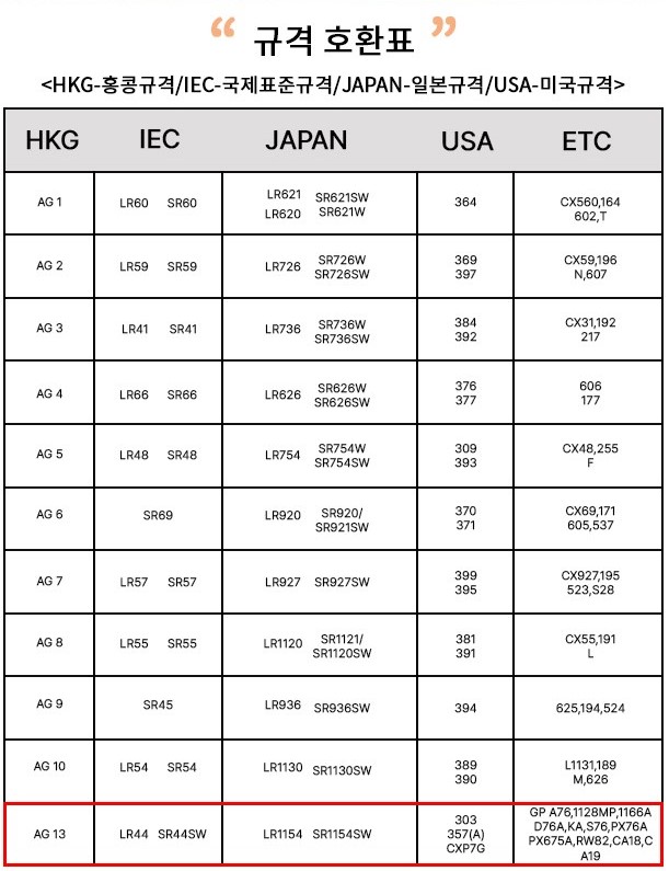 회중시계 총 5알 AG13 건전지 배터리 LR44 357A 호환